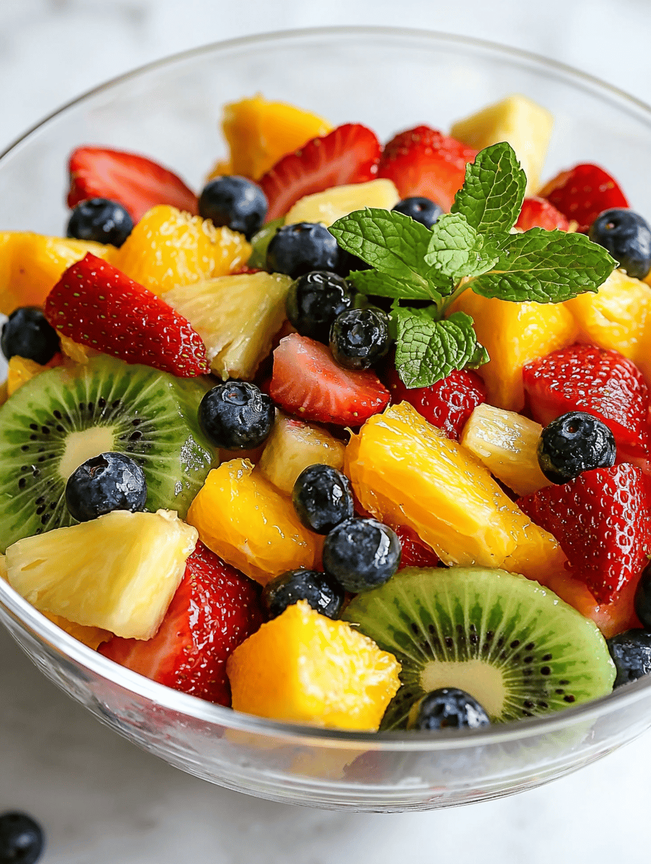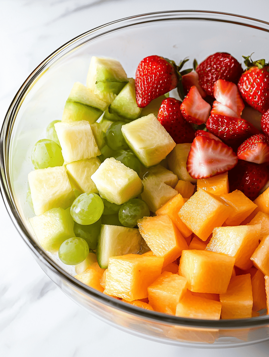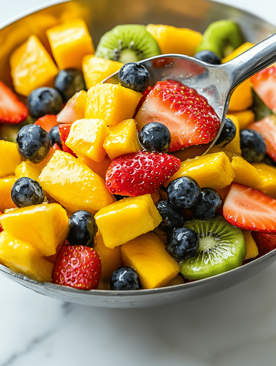 This fruit salad combines a variety of fresh, ripe fruits without any cooking or elaborate prep. The ingredients are gently mixed to preserve their natural textures and juiciness, resulting in a colorful, tender, and juicy final dish. It showcases a chaotic harmony of crisp, tender, and silky elements, perfect for quick and refreshing snacking or serving at gatherings.