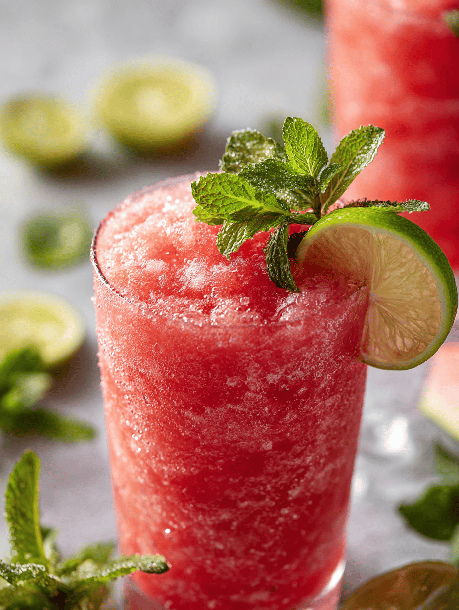 This watermelon slushie is a vibrant, icy beverage made by blending juicy watermelon with fresh lime juice, mint leaves, and ice to create a refreshing, frosty drink. The final texture is thick and slushy, with a bright red color and a burst of citrus and mint aroma, perfect for hot summer days.