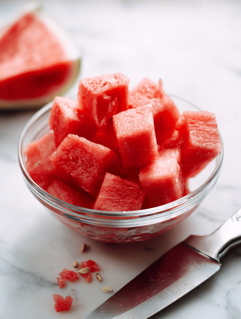 Chop the watermelon into roughly 1-inch cubes, removing any seeds if you prefer a seedless texture.