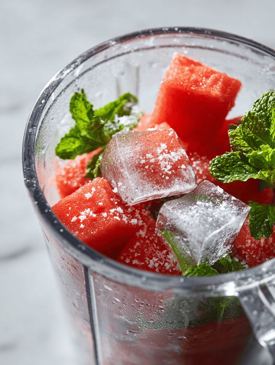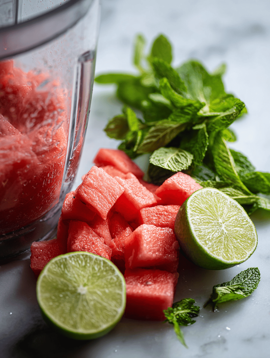 Add the watermelon chunks to your blender, then squeeze in fresh lime juice and toss in the mint leaves.