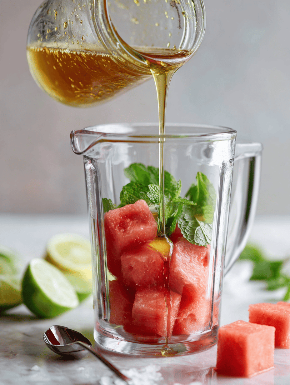 Pour in the honey or agave syrup, adjusting the amount based on the sweetness of your watermelon.