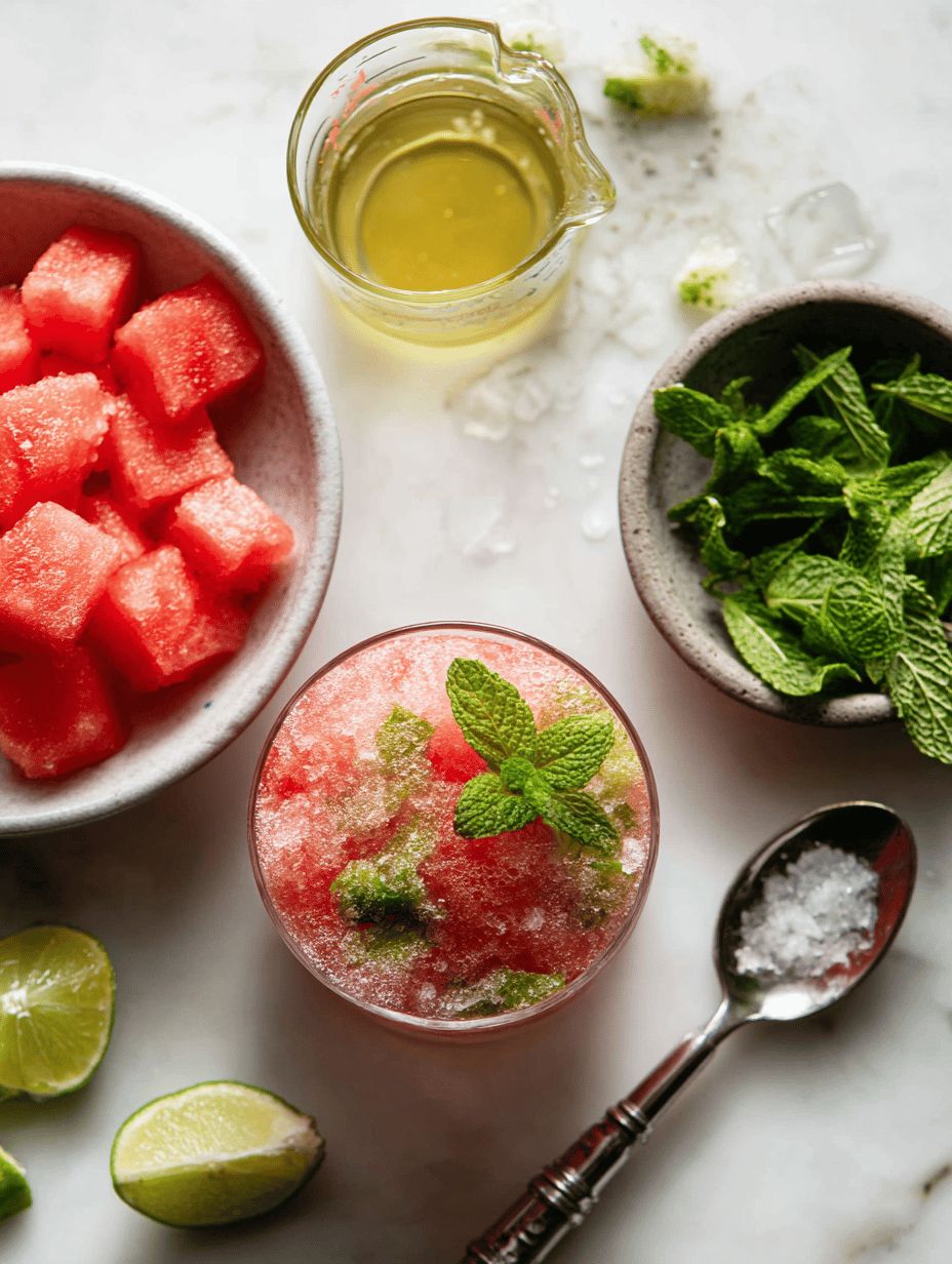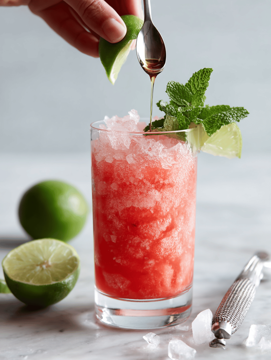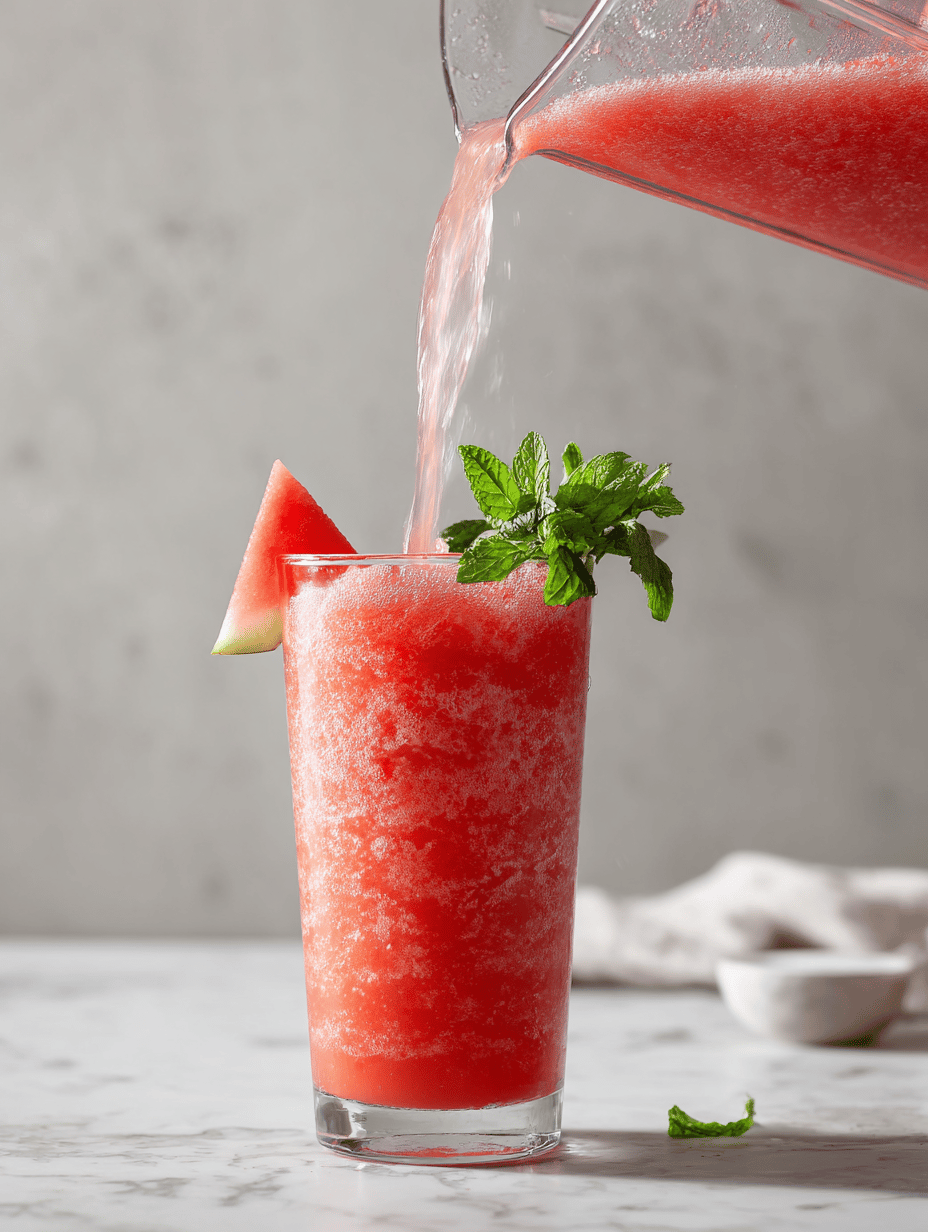 Pour the icy slushie into glasses, garnishing with a sprig of mint or a small watermelon wedge for a pretty finish.