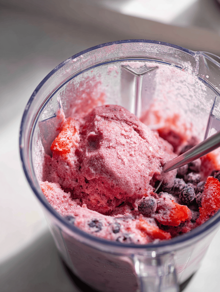 Stop the blender and check the texture; it should be thick, scoopable, with a crackly icy surface. If it's too thick, add a splash of club soda or water.