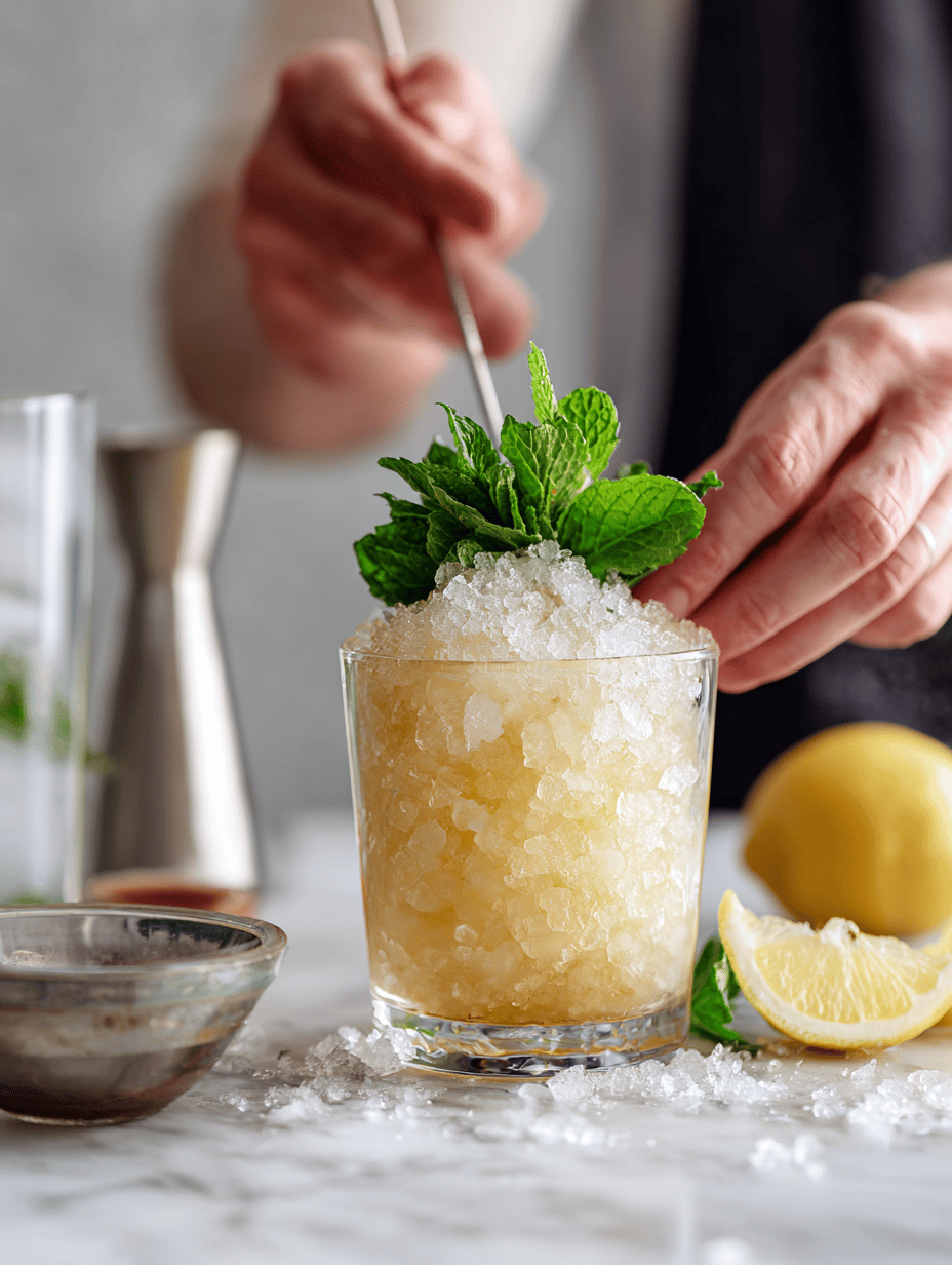 Garnish with a sprig of mint or a lemon wedge for a fresh touch, then serve immediately to enjoy the frosty, boozy goodness.