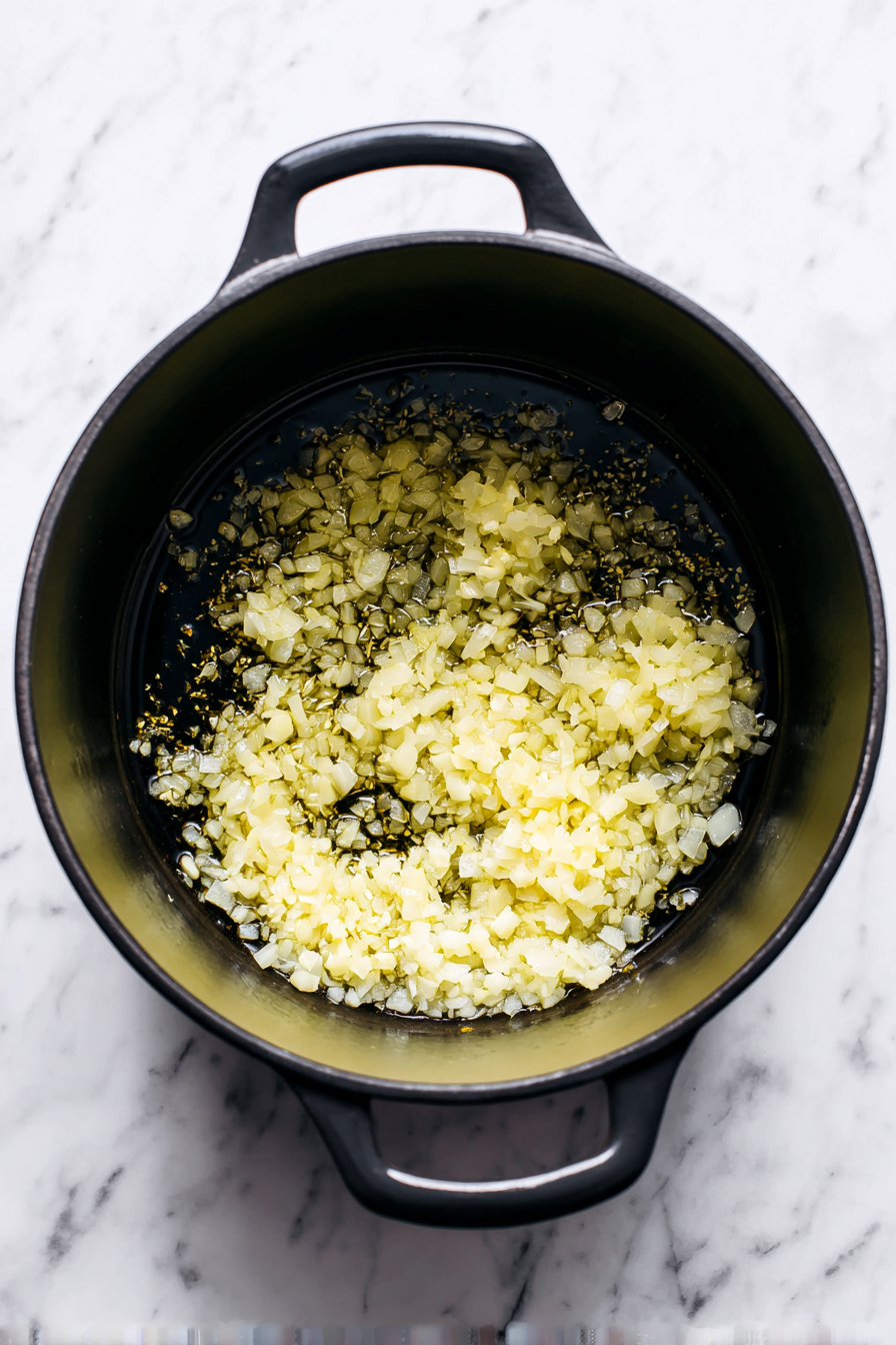 Add chopped onion and garlic, sauté until soft.