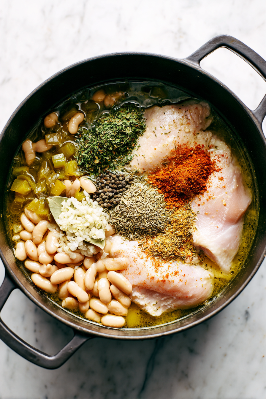Pour in chicken broth, then stir in beans, green chiles, oregano, cumin, and cayenne.