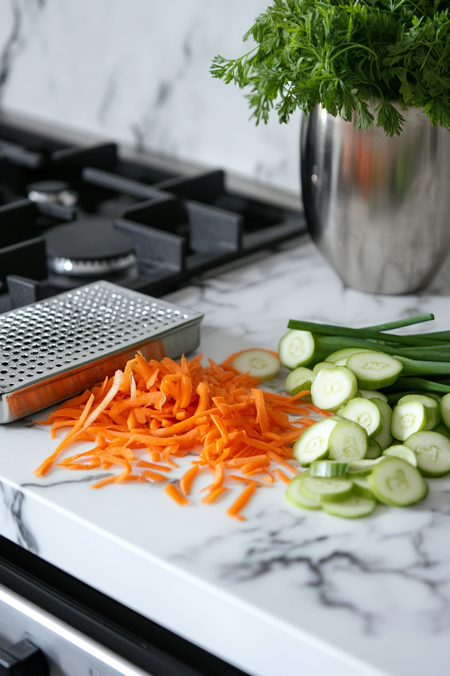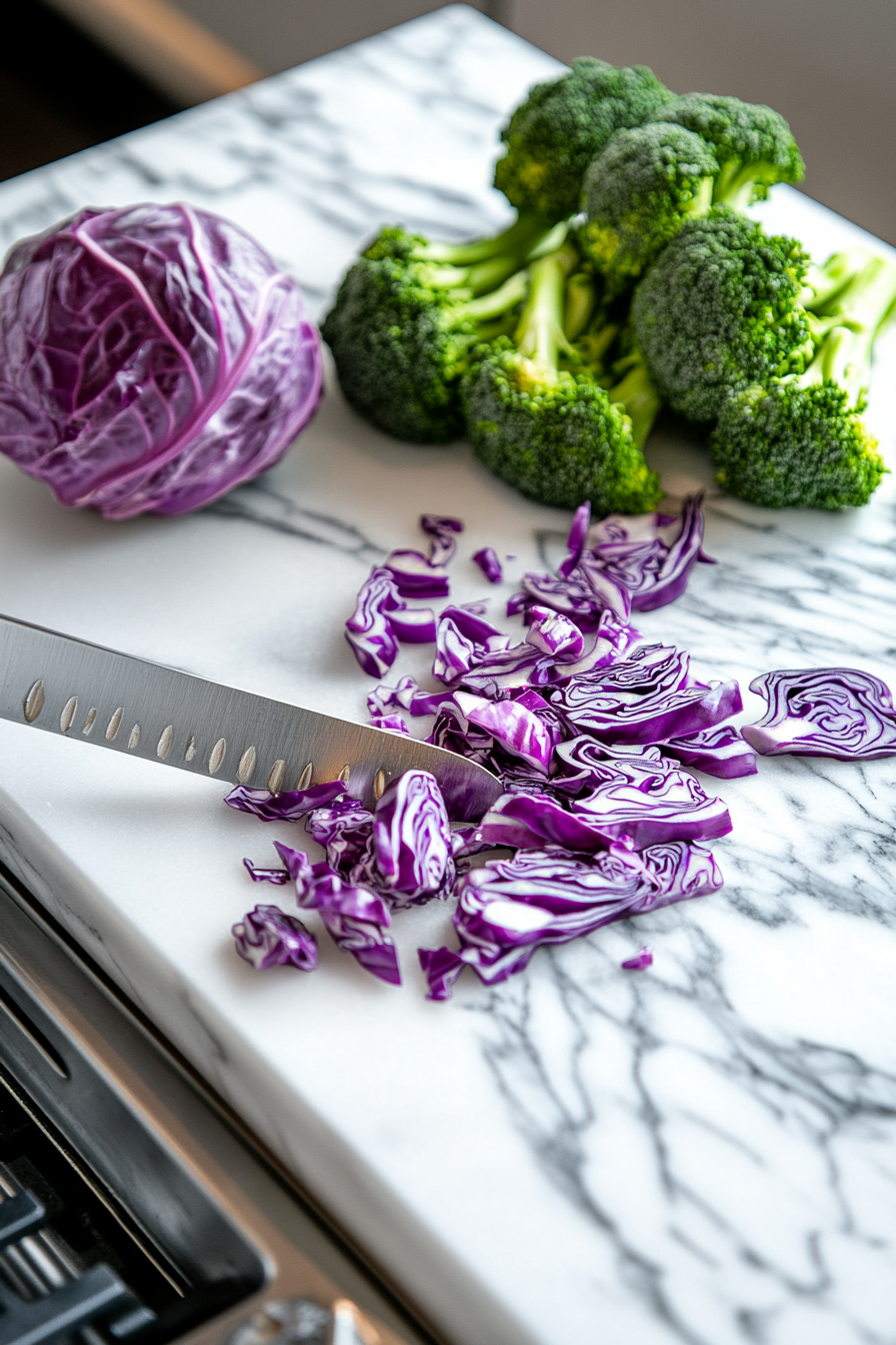 Finely chop the cabbage and broccoli and place them in a large mixing bowl.
