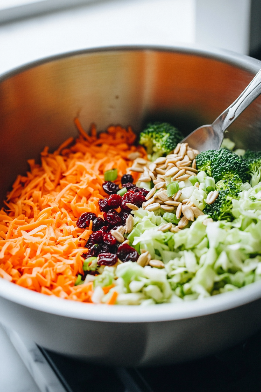 Add the shredded carrot, sliced green onions, sunflower seeds, and dried cranberries to the bowl with cabbage and broccoli.