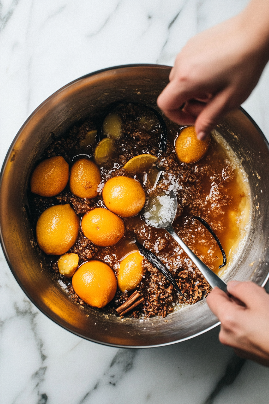 Combine toasted spices, chopped oranges, cane sugar, and seeded vanilla bean in a large bowl.