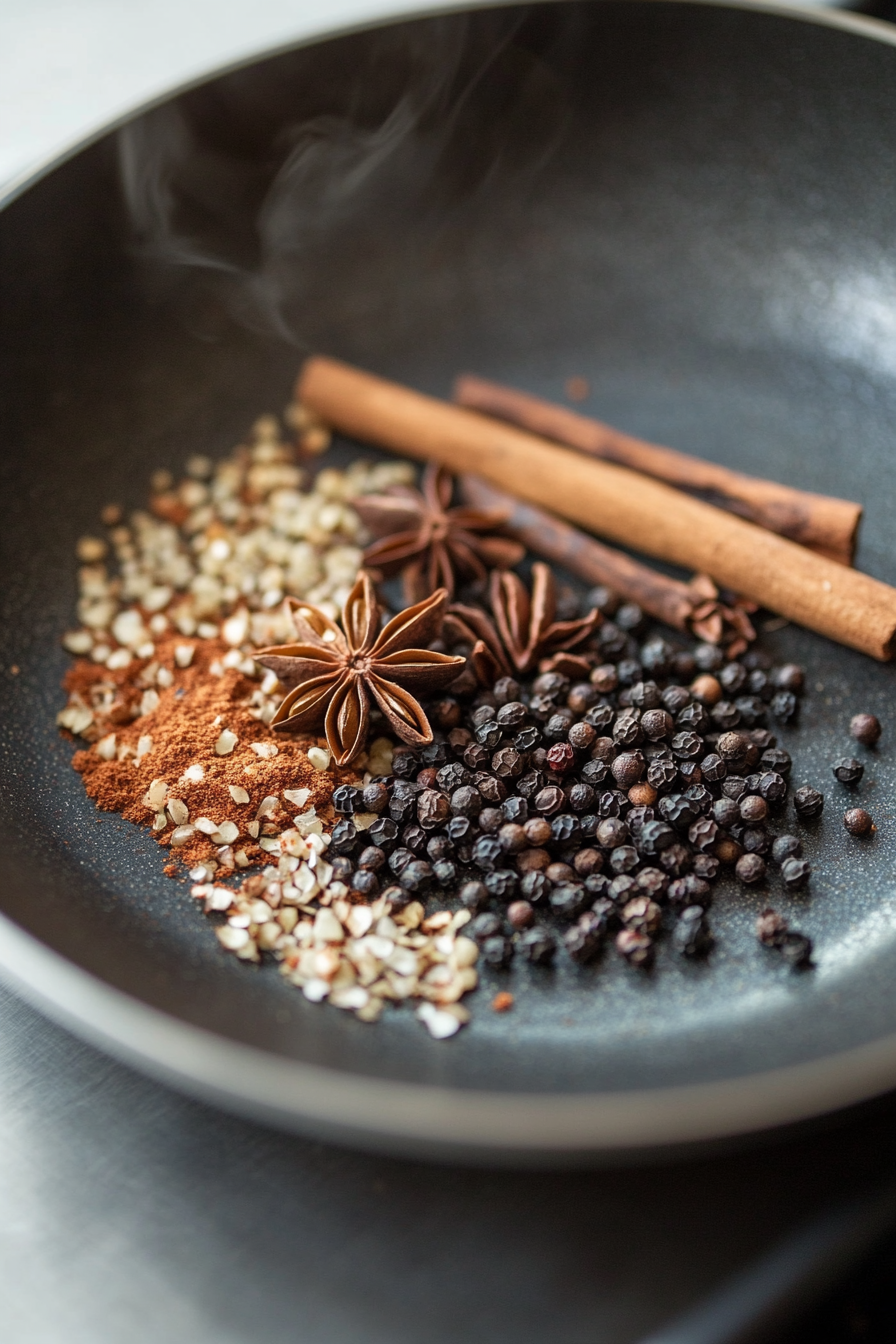 Crush cloves, star anise, peppercorns, and cinnamon stick in a skillet until fragrant.